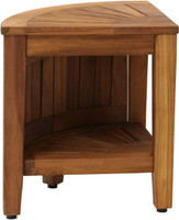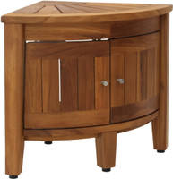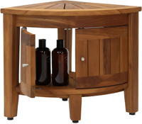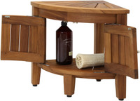 Built using our OptiAREA™ space saving design, this teak shower stool is made to fit in the corner of your shower or bathroom! This beautiful little teak corner shower seat is the perfect accent piece for your bathroom, patio, or poolside. Made in an elegant spa style, the teak shower stool is designed to be both convenient and aesthetically appealing. This teak bench also includes front-facing doors for an elegant, hidden aesthetic for your shelf accessories