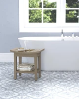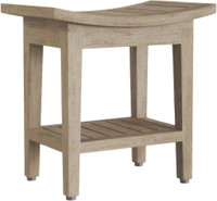 Introducing the Maluku Mist Teak Shower Bench with Shelf by AquaTeak – a harmonious blend of form and function, bringing elegance and practicality to your bathroom or spa. Immerse yourself in the luxury of this meticulously crafted teak shower bench, expertly fashioned from sustainably sourced teak wood. The Maluku Mist Teak Shower Bench stands as a testament to AquaTeak's commitment to superior craftsmanship and innovative design. With its mist finish, this bench exudes a modern and sophisticated ambiance, while the natural beauty of teak wood adds warmth and timeless charm. Crafted with precision from sustainably harvested teak wood, known for its durability and resistance to moisture, this shower bench is designed to withstand the humid bathroom environment. The mist finish complements the teak's warm tones, creating a visually stunning and tranquil aesthetic. Featuring a convenient shelf, this teak shower bench offers storage space for bath essentials, making it both practical and stylish. The finely sanded surface showcases the natural grain patterns of the teak wood, adding to the overall visual appeal. Elevate your shower experience with AquaTeak's Maluku Mist Teak Shower Bench with Shelf – a perfect union of style and functionality. Immerse yourself in the luxury of sustainable teak wood and embrace the seamless blend of form and function in your daily routine. Product Dimensions: 18" x 12" x 18" Product Weight: 11.4 LBS