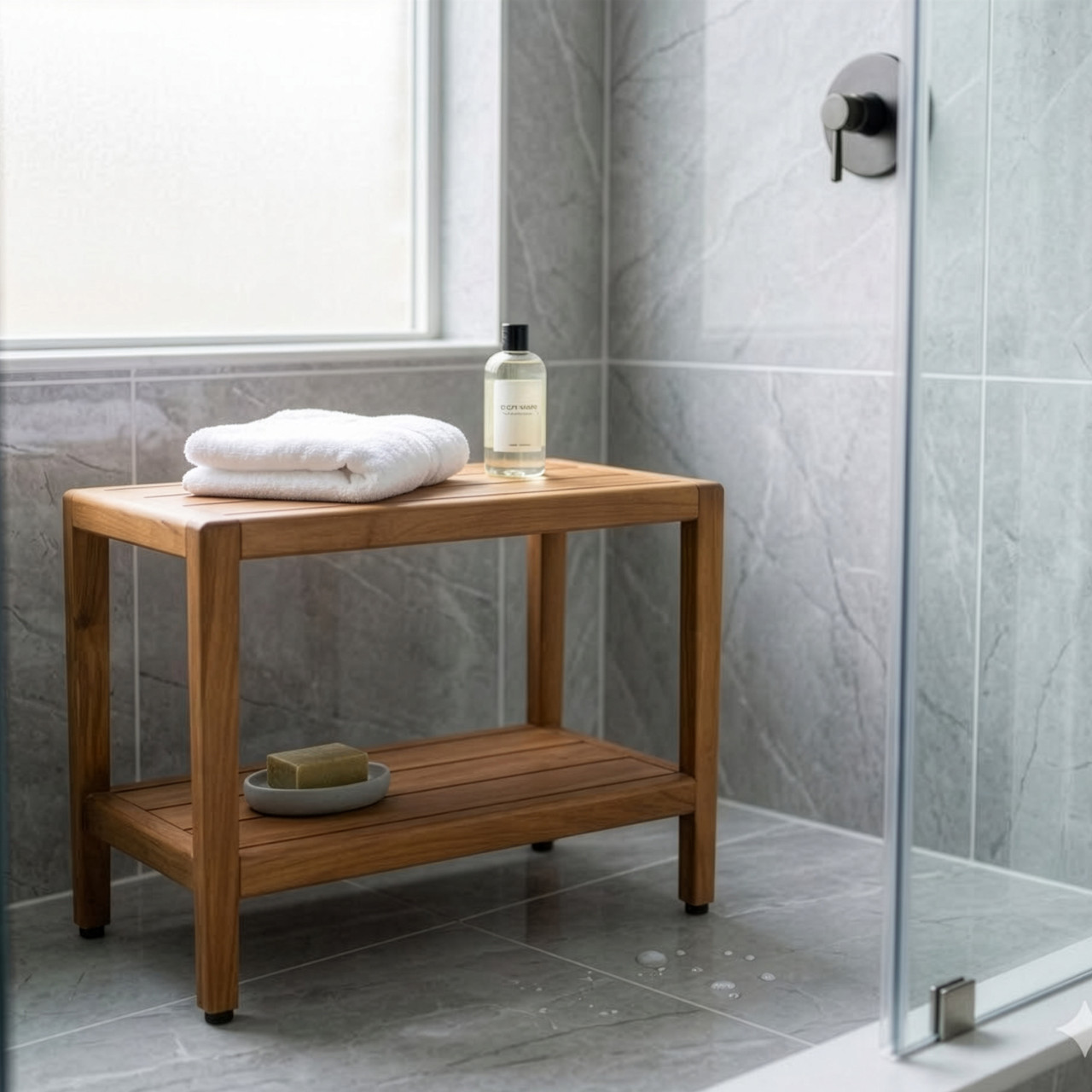For a slightly different version of the sleek, stylish 24" Maluku-Bjön™ Teak Side Table & Shelf, choose this side table with a solid design on the top and on the shelf. Our teak wood shower benches and other tables are perfect for making your bathroom feel like a five-star hotel.
