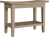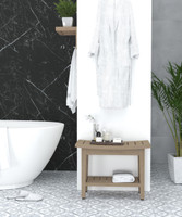 Take a seat on our beautiful teak shower bench! AquaTeak®'s OptiAREA™ space saving Maluku™ teak shower bench is perfect as a teak shower seat, but the convenient size makes it easy to use in any location. The adjustable rubber padded feet ensure safety and stability on wet tile when used as a teak shower stool, but the beautiful design allows for this beautiful teak bench to seamlessly integrate in any décor. Functional Roomy Stable in wet environments This teak shower bench includes plenty of seating space, and also features an extra storage shelf for added functionality. We are so confident that you will love your teak bath bench that we offer a 30 day satisfaction guarantee and 5 year warranty on all of our products! (Some assembly required) Spacious Extra shelving Product Dimensions: 24" x 12" x 18" Product Weight: 15.6 LBS