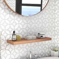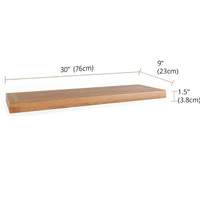 This solid wood floating teak shelf can be used for products such as towels, vases, pictures, soap, and other amenities or accent items. Shelf holds up to 10 LBS