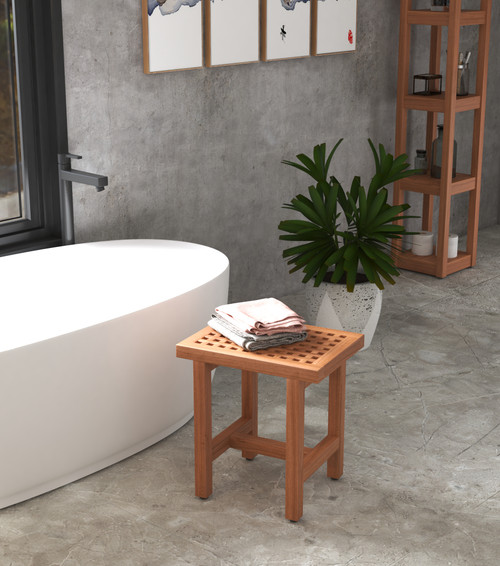 Don’t let small spaces go to waste. This teak shower bench is the perfect size to turn a corner into a touch of luxury. The simple design of this teak bench makes it fantastic for spaces that just need that extra something. The grate design keeps water from pooling, and the teak itself is impervious to water. You will love the rich, golden-brown color of the teak as well as its silky-smooth texture. This bench may be on the small side, but it has been constructed with sturdiness in mind. Its rubber feet keep it stable and prevent sliding. This is a teak bench that won’t rock or break down. Invest in yours today and enjoy our 30-day customer satisfaction guarantee!