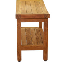 This OptiAREA™ space-saving teak shower bench is the ideal size and includes a shelf for extra storage space. The compact teak bath seat has amazing versatility and is elegant enough to be used indoors as a decorative end table or teak shower stool.