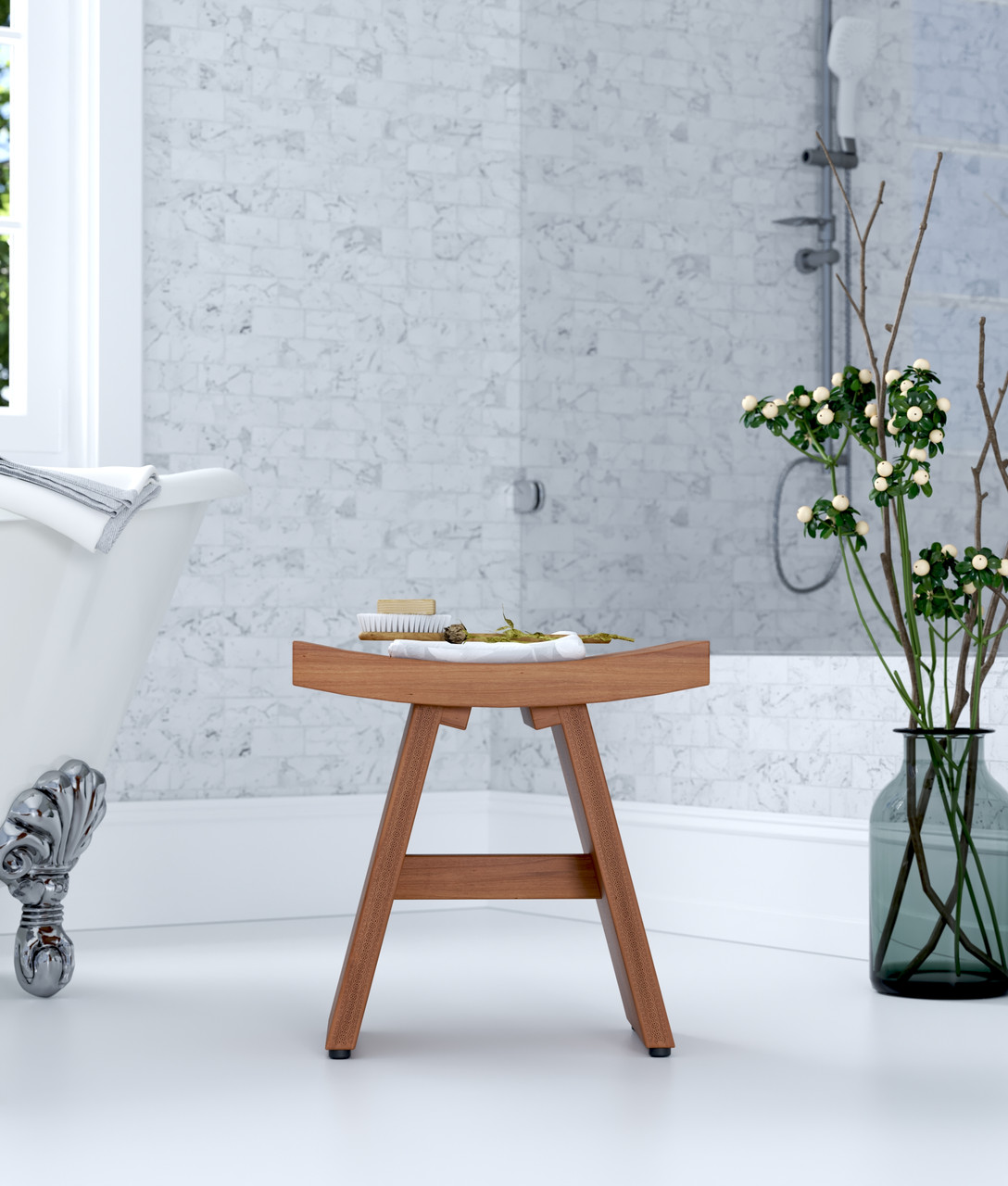 Our traditional Asian teak shower bench is a stunning combination of modern design and ancient tradition, and now features beautiful carved leaves on the left leg. Our imported and environmentally friendly solid teak wood is durable and naturally water-resistant, so you will be able to enjoy your teak bath stool for years to come.