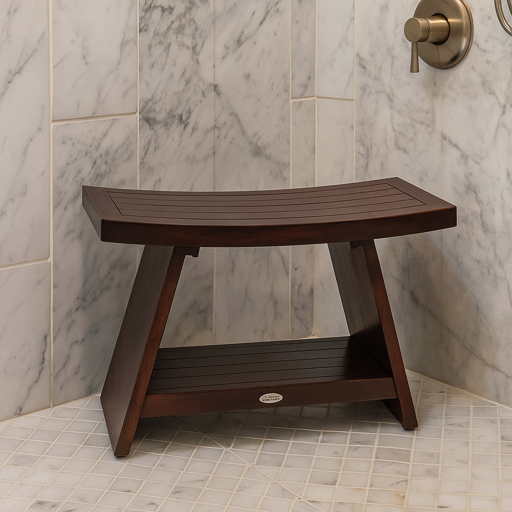 Like many of our teak shower benches, this bath stool includes an additional shelf for extra storage space, and rubber padded feet for stability and security. Our new "mocha" finish provides just the right accent for any bathroom in need of extra storage and elegance. The product's proprietary rich dark stain greatly enhances the Teak woods ability to repel water & dirt. Enhancing the wood grain and color the rich stain finish also repels soaps and lotions and has a built-in Mold & Mildew inhibitor. Handcrafted using only environmentally-friendly and sustainably harvested wood, this teak shower seat is naturally water-resistant and extremely sturdy. And of course, it is backed by our 30-day satisfaction guarantee and 5 year warranty, as are all of our products. (Some assembly required)