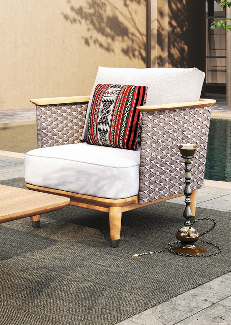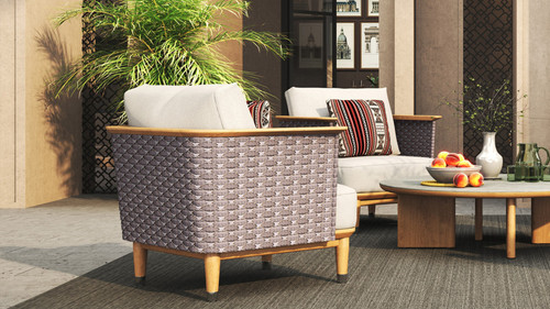 The Adagio Outdoor Seat expertly blends indoor comfort with outdoor durability, featuring intricate rope details and deep cushions that exude coziness. The solid teak armrests provide optimal support, making this sofa a luxurious addition to any outdoor space.