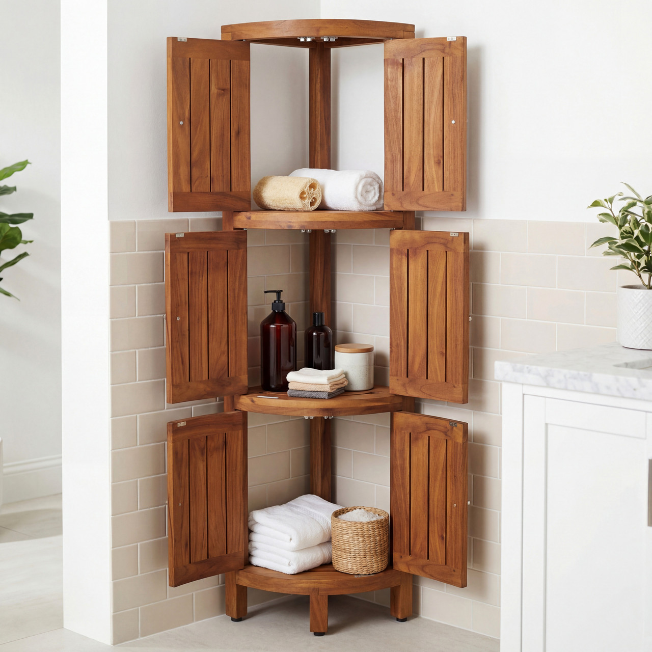 Quick view Compare Add to Cart The item has been added Kai-Mist Four-Tier Corner Teak Bath Stand with Front-Facing Doors MSRP: Was: Now: $399.95