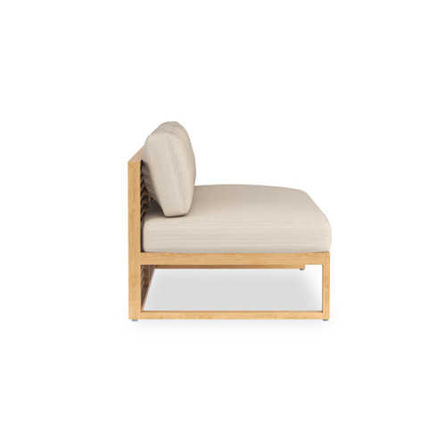 The Splendor Modular Teak Middle Two-Seat features a modern design, fully crafted from solid teakwood. A stainless steel rod runs through the center, enhancing strength and durability. Paired with plush, removable cushions, this piece offers a polished and cohesive look for your outdoor lounging space.