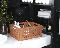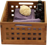 Convenient Storage for Limited Space Bathroom storage is always tricky, and there never seems to be enough. We suggest choosing your favorite theme and substituting storage space with our beautiful teak bins. Handcrafted from naturally-harvested Indonesian teak wood, they are durable and water resistant. Product features: Grade A teak wood is water and warp resistant Simple design Modern aesthetic with grated walls A convenient size, this bin is small enough for a countertop while being deep enough to hold your bathroom accessories with ease. Guests will love the look of your new storage and the entire look of your bathroom will be elevated to a new level. Product specs: Teak wood Dimensions: 16" x 13" x 7" Weight: 5.5 LBS As always, our quality-made furniture is backed by our 30-day satisfaction guarantee, a 5-year limited manufacturer warranty, and free shipping in the continental United States!