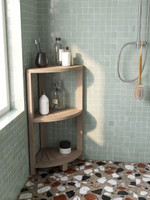 Stylish teak storage solutions! With a sleek corner profile and three-tier shelves for optimal organization, this is one teak corner shelf you’ll want for every space! The natural teak wood ushers elegance and an organic style that melds with every personal home decor taste! Rubber footing for safety Great in wet/humid spaces Functional This functional and multi-faceted three-tiered teak shelf goes great in your bathroom or even as a plant stand! It’s water-resistant and a natural teak wood material that ages well. Water-resistant Sturdy Great for organization Some Assembly Required Product Dimensions: 12" x 12" x 26.5" Product Weight: 10 LBS Distance between shelves: 11"