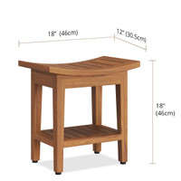 Ditch other materials and rejuvenate your space with teak! This OptiAREA™ space saving teak bath bench is a fantastic choice for any space. The compact design of this teak shower bench allows for both functionality and convenience, and includes a handy shelf for additional storage space. Convenient Sleek profile Safe in wet/humid conditions This teak shower seat also features adjustable rubber padded feet for safety and stability in any location! Naturally water-resistant, the teak shower stool is suitable for use both indoors and outdoors. Stainless steel hardware Indoor/outdoor use Weather-resistant Our teak wood is all sustainably harvested and environmentally friendly, and includes stainless steel hardware for added durability. We offer a 30-day satisfaction guarantee and five year warranty on all of our products! (Some assembly required) Product Dimensions: 18" x 12" x 18" Product Weight: 11.4 LBS