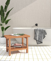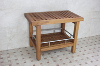 Our teak bath stool is made from durable, sustainably-harvested teak wood. Including a convenient extra shelf with stainless steel accents, this teak bath bench provides plenty of storage room, while the adjustable rubber-padded feet ensure safety and stability in any wet environment or location.