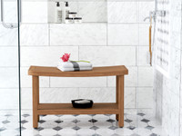 This OptiAREA™ space-saving teak shower bench is the ideal size and includes a shelf for extra storage space. The compact teak bath seat has amazing versatility and is elegant enough to be used indoors as a decorative end table or teak shower stool.