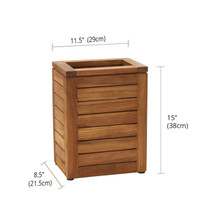 Teak Has A Place In Every Accessory — Even The Trash Can! Even your rubbish can be tossed out with style! This solid teak wood wastebasket from AquaTeak® is as functional as it is beautiful. No need to hide your wastebasket from view when it is as elegant as this one. Sustainable teak wood Functional and beautiful Perfect in any space — indoor or outdoor Because this wastebasket is made from naturally harvested teak wood, it is naturally weather-resistant and waterproof, and incredibly durable. This teak wastebasket will withstand the test of time, in any environment, which makes it ideal for your bath, spa, or poolside. Place one of our teak waste bins anywhere you have guests to help add elegance. If your waste bin begins to appear weathered, simply use our teak oil to restore it back to new. Durable Made to weather wet and humid conditions Product Dimensions: 11.5" x 8.5" x 15"; Product Weight: 10.5 LBS