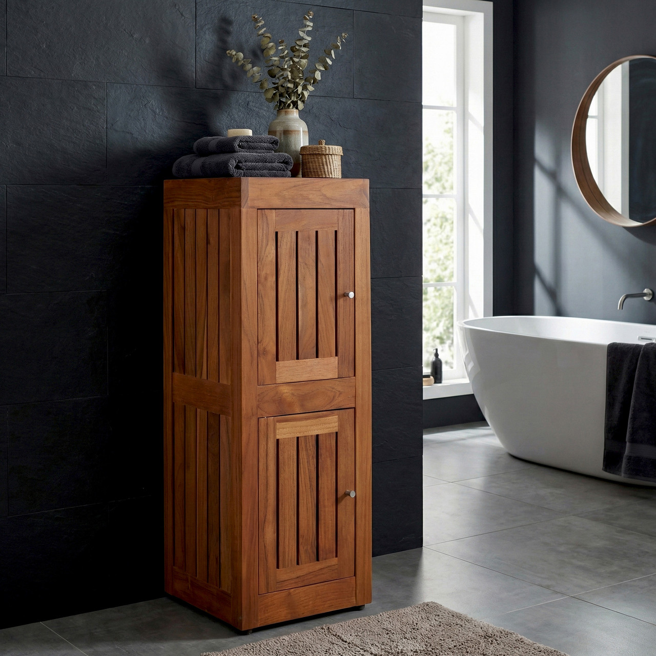 Crafted from solid teak and designed with clean, squared lines, the Sula Three-Level Teak Tower Floor Cabinet brings natural warmth and practical storage to any bathroom. Three spacious tiers are enclosed behind slatted doors, offering airflow and keeping towels, toiletries, and other bath essentials neatly tucked away. The square silhouette gives it a grounded, modern look, while the fully assembled design means it’s ready to use right out of the box. A beautiful and functional piece that elevates your bath space with ease.