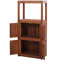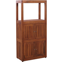 Elevate your bathroom storage with the Sula Three-Level Teak Tower Floor Cabinet with Display Shelving with Doors and Open Top. Expertly crafted from solid, sustainably sourced teak, this tall and sturdy unit features two enclosed cabinets with slatted double doors for concealed storage, plus an open top shelf for easy access or display. The vertical design maximizes storage without taking up floor space, while the teak’s natural moisture resistance ensures long-lasting durability—even in humid environments. Perfect for storing towels, toiletries, and décor, this fully assembled piece brings function and refined warmth to any bath space.