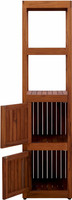 The Sula Four-Level Teak Tower Floor Cabinet with Display Shelving brings together sleek design and smart storage in a space-saving vertical format. Crafted from solid, sustainably harvested teak, this tall cabinet features two slatted-door compartments for discreet storage and two open display shelves for towels, baskets, or decorative items. Naturally resistant to moisture and decay, teak is perfect for humid environments like bathrooms and spas. With its clean lines and rich wood tone, this fully assembled piece adds both function and warmth to any space.