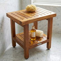 This teak bath stool is built to last with eco-friendly, sustainably-harvested teak wood and is versatile enough to be used as a teak shower seat or decorative accent table. Including all stainless steel hardware, our teak bath bench includes a convenient storage shelf and rubber padded feet for safety and stability. We're confident that you'll love this teak shower bench so much that we offer a complete 30-day guarantee and five year warranty!