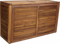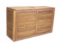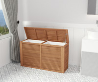 Enjoy the convenience of this lovely double-sided teak laundry hamper anywhere in your home! This beautiful AquaTeak solid teak wood laundry hamper would also make a perfect toy chest or teak bench with storage. This unit is versatile and can be used indoors or out, and is made from durable and naturally water-resistant solid teak wood. Durable Water-resistant Indoor/outdoor use The pneumatic lid opener offers added convenience — the teak hamper lid will remain open while you're using the storage bin. Additionally, the teak hamper includes sturdy, removable velcro drawstring bags for even easier storage and transportation of laundry or other items! Removable/washable lining Pneumatic hamper lid Two, separate spaces